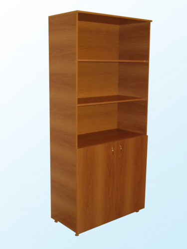 изготовлен из ЛДСП, торцы облицованы кромкой ПВХ 0,4 мм. Имеются 3 открытые и 2 закрытые дверями ниши. На дверях установлены ручки-скобы металлические. Шкаф снабжен ножками-опорами регулируемыми по высоте